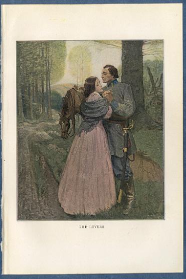 The 5" x 7 1/4" N C Wyeth 1911 Civil War Color Print THE LOVERS shown below is in excellent condition - no holes, tears, stains, etc. It was accomplished by Wyeth for the 1911 publication of the Civil War novel THE LONG ROLL. The print carries Wyeth's signature in the lower right corner (should be visible on your monitor). Plenty of margin for matting and/or framing and a nice item to add to a Wyeth or Civil War collection.